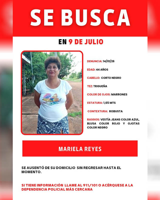 Según el reporte oficial, la mujer es de tez trigueña, tiene cabello corto de color negro, ojos marrones, una estatura aproximada de 1,65 metros y contextura robusta. Al momento de ausentarse vestía jeans de color azul, blusa roja y ojotas negras.