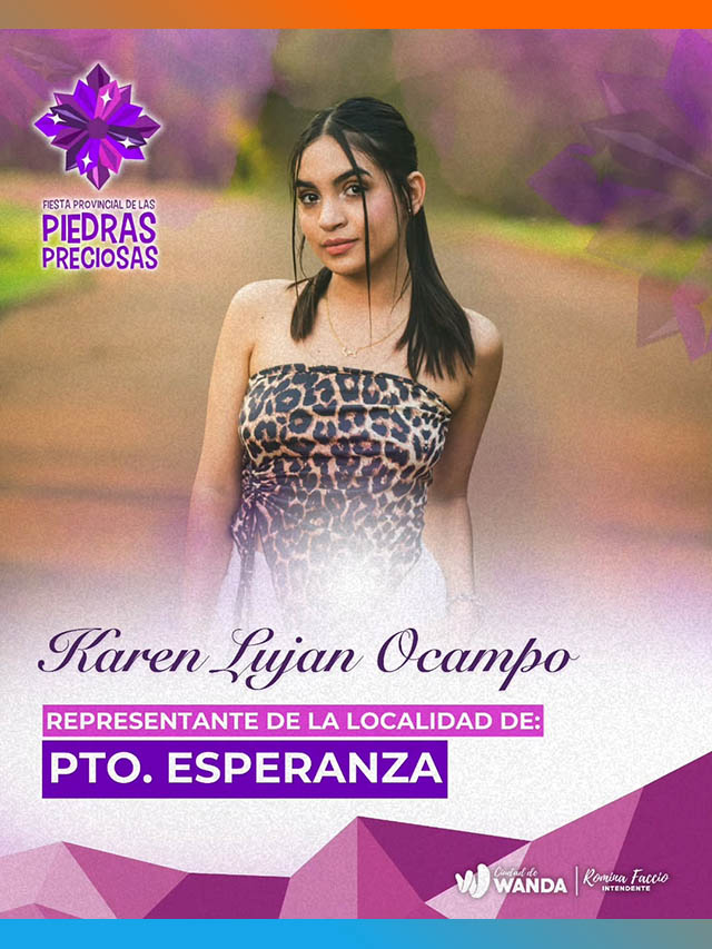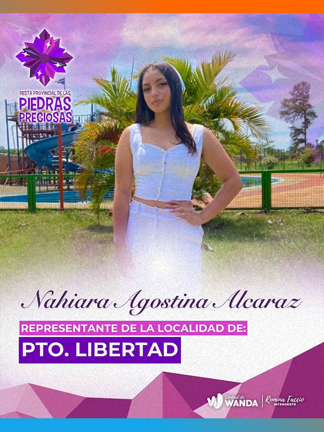 Las aspirantes son: Nahiara Agostina Alcaraz, de Puerto Libertad; Agustina Dávalos, de Wanda; Verónica Esquivel, de Comandante Andresito; Luz Tiziana Cabrera, de Puerto Iguazú; Karen Luján Ocampo, de Puerto Esperanza; Stefany María Ranger, de Eldorado; Antonella Estefanía Torres, de Montecarlo; Milagros Ayelén Velázquez, de Garupá; y Katherine Yanet Villalba, de Puerto Rico.